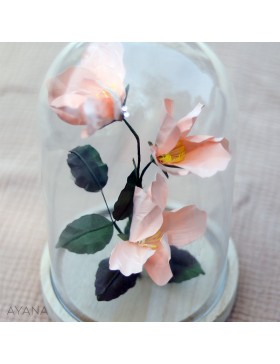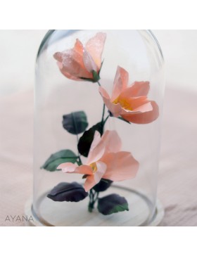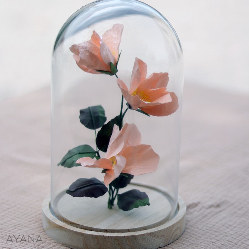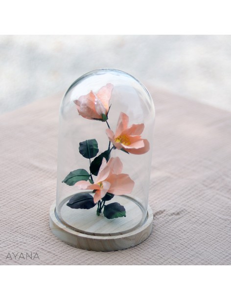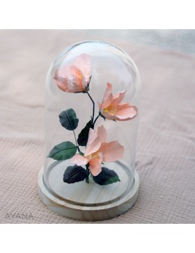 Floral arrangement under a glass dome featuring handcrafted paper wild roses.