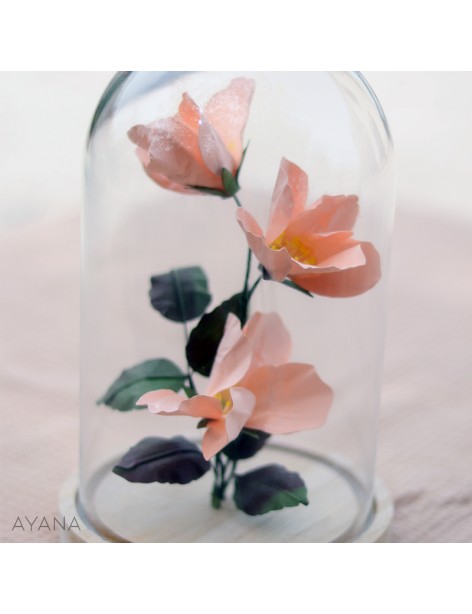 Beneath its glass dome, the paper wild rose reveals all its natural charm. Handcrafted with care, its peach hue blends delicacy and character, softness and authenticity. A poetic creation that brings timeless elegance to any space.