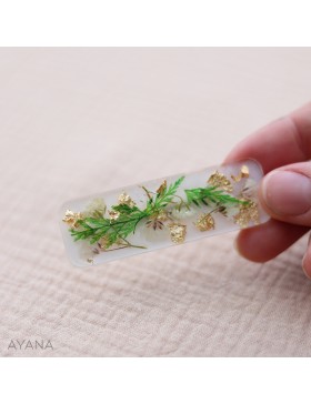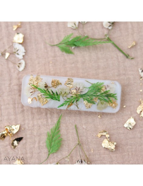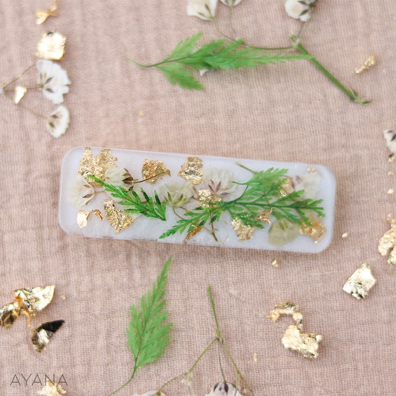 Handcrafted from epoxy resin, the ELIA barrette features stabilized fern, dried gypsophila, and delicate gold leaves — a poetic fusion of greenery and golden light.