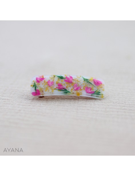 Handmade in epoxy resin, the BAYA hair clip encases real dried natural flowers: fuchsia phalaris, fresh green fern, and delicate sanfordi petals.