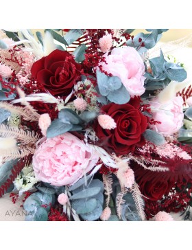Un bouquet qui réunit avec grand chic les deux reines incontestées du monde des fleurs : la rose et la pivoine. Des roses d'un rouge profond exprimant la passion et l'énergie positive, associées au charme tendre et délicat des pivoines, donnent à ce bouquet au style affirmé, vibrance et raffinement.