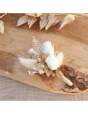 Deux boutons de roses blanches éternelles avec de subtiles touches de doré confèrent une élégance classique et intemporelle à cette boutonnière. Un accessoire raffiné et tendance qui apportera une note bohème chic à la tenue du marié et de ses témoins. Elle pourra également faire office de broche pour les dames.