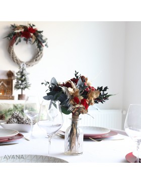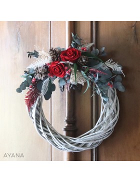 Création artisanale en fleurs naturelles séchées et stabilisées réalisée sur une couronne en osier.